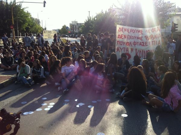 Οι μαθητές του 5ου λυκείου πραγματοποίησαν το πρωί καθιστική διαμαρτυρία έξω από το χώρο του σχολείου στην οδό Κύπρου και συμβολικά πέταξαν τα dvd, φωνάζοντας: